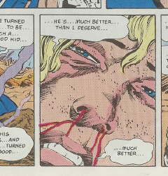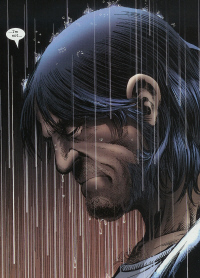 | Here, Wolverine is emotionally drained by his recent battle -- just another example of the complex emotional life given to contemporary heroes. From: Wolverine, Vol. 1: The Brotherhood, Copyright 2003 by Marvel Comics. |
